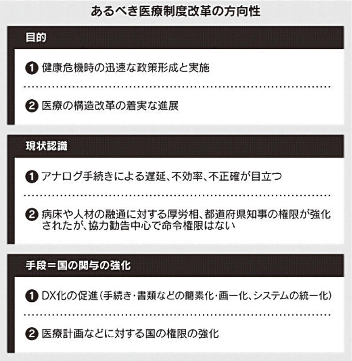 医療の地域性は高いので、都道府県が策定する医療計画が本筋だ。法改正により、都道府県知事は域内の個別医療機関と平時に協定を結び、感染症まん延時には、医療提供についての勧告、指示、指示違反の公表ができるようになったが、命令権限はない。協定の書式は国が統一し、個々の協定に地域性や個別性が発揮されないようにすべきである。