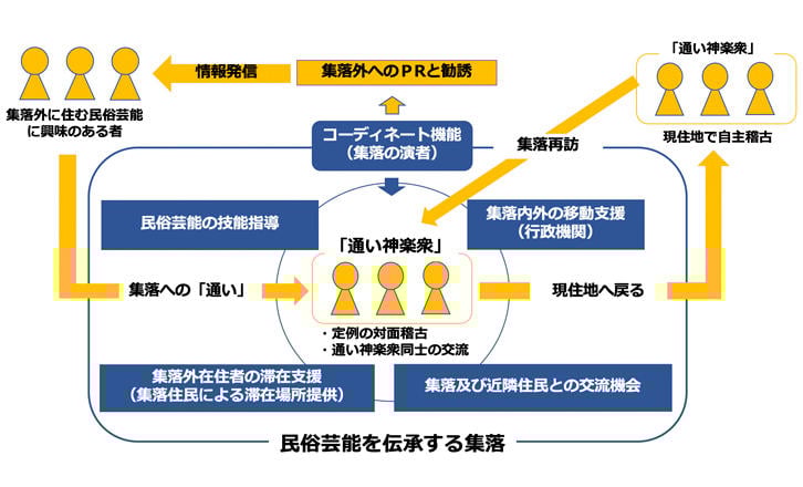 こうした事例を踏まえ、演者確保の範囲を集落に生まれ、育った者だけではなく、民俗芸能に興味を持つ集落外に住む者にまで拡大し、「集落外の演者」が集落の演者とともに芸の伝承活動に参加可能となる仕組みとして「通い神楽モデル」を開発し、通ってくる集落外の住民とともに仕組みをつくり上げる活動の可能性を探った。