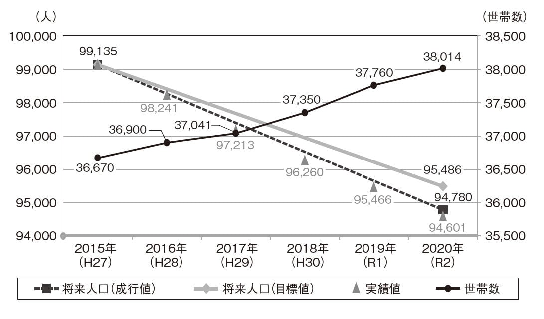 花巻市の総人口は2000年の107,175人をピークに人口減少が続き、2020年には、94,601人に減少し、2015年度に策定した花巻市人口ビジョンの想定よりも人口減少が進行している状況にある。