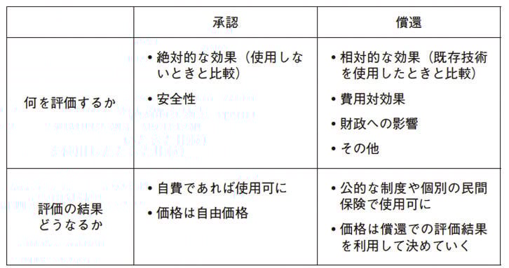 また、健康改善効果についても、「承認」では新しい技術そのものの絶対的な効果が重要となるが、「償還」ではこれまで使っていた技術と比べた相対的な効果が重要となる。使用しないときに比べて使用した時に安全で健康改善があれば「承認」されるが、「償還」では既存技術を使用したときに比べてより健康改善が得られるかどうか、さらにそれが費用に見合うかどうかが重要となる。