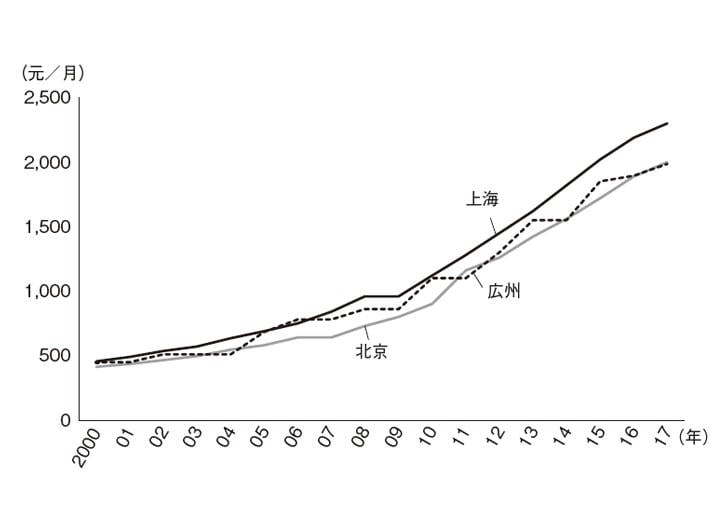 考えられる一番の要因は、輸出製造業にとって重荷となる人件費の上昇である。図2に示したのは、北京、上海と広州の最低賃金の推移である。過去15年間、ほぼ毎年10%ずつ引き上げられている。中国の輸出製造業の中でも、半導体や機械など高付加価値の産業は人件費の上昇にある程度は対処できるが、シューズ、繊維や雑貨などの中・低付加価値産業にとって人件費の急騰は死活問題である。中国に進出している外国企業はもとより、地場の輸出企業でも工場の海外移転が相次いでいる。