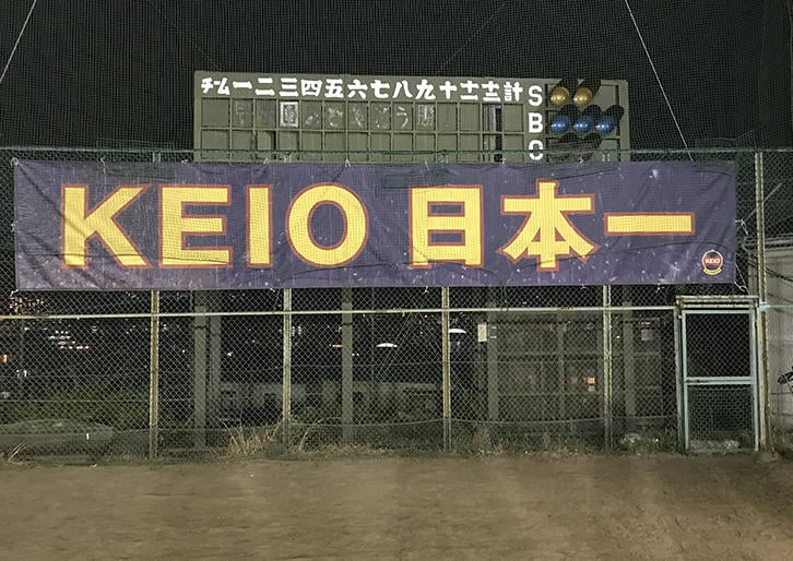 日吉キャンパスの最深部、我らが日吉台球場に「KEIO 日本一」の横断幕を掲げて17年、ついに夢が実現した。もし、この横断幕が今回の快挙に1ミリでも役立ったとしたならば、感無量だ。