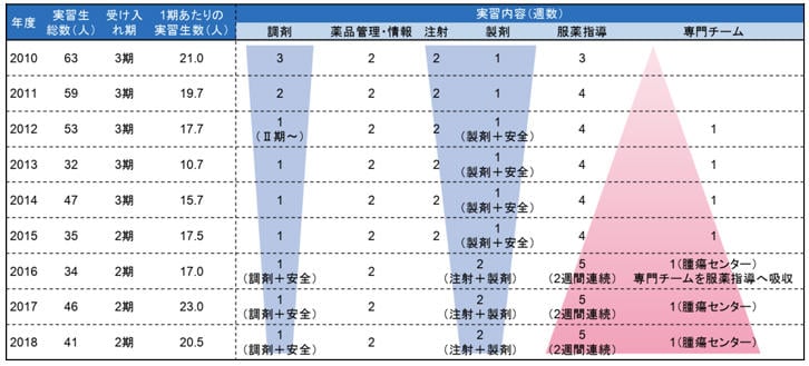 当初の実習プログラムは調剤、注射調製を中心に構成された「物」が主体のプログラムであった(表)。しかし、6年制薬学教育の病院実務実習では、病棟での服薬指導やチーム医療に、より多くの時間を割くことが期待されていた。このため、これらの活動を学生に体験してもらえる状況を作り出す必要があった。このことが、薬剤部が業務を見直し新たな業務に取り組むことに繋がった。ともすれば保守的な傾向があった薬剤部が新たな薬剤師業務を目指して歩み始めたことは、薬学部生の受け入れが引き起こしたシナジー効果とも言える。表に示すように、現在では調剤や注射調製の実習期間は半減し、服薬指導と専門チームの病棟活動の実習期間が倍増している。これを可能としたのは、薬剤師の資格を必要としない業務を外部業者に委託できるよう人材雇用面での人事部の配慮があってのことである。現在は、病棟薬剤業務の実習期間は他の病院と遜色ないまでになってきており、外来調剤についてはむしろそれを経験できることが、慶應病院の「売り」にもなっている。