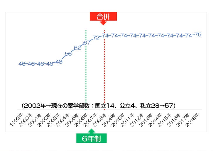 このような老舗の共立薬科大学が慶應義塾との合併を希望した背景には、当時の日本の薬学部の状況が大きく影響している(図)。合併前後の日本では、少子化による大学入学志願者数の低下傾向に加えて、新たな薬系大学が次々に認可され、2002年までの46校から2008年には74校にまで急増し、学生数の確保のみならず質の低下も懸念される状況であった。さらに薬学教育6年制の開始で病院・薬局における長期実務実習が義務化され、病院を持たない多くの単科の薬科大学では優秀な入学者の確保に加えて実務実習をどう行うかに腐心していた。