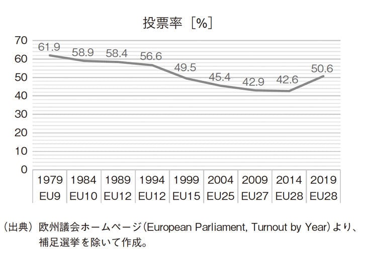 ヨーロッパの若者たちの環境対策に対する政治活動は、現実の政治に影響を及ぼし始めている。2019年5月末にEU加盟各国で実施された欧州議会選挙では、とくに独仏を中心に環境政党が大幅に議席を増やした。さらに、投票率が20年ぶりに50%を超えたことも注目された(図1)。
