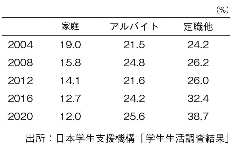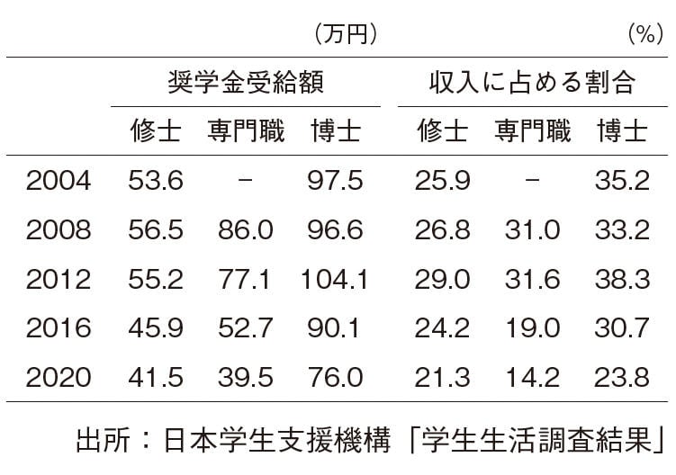 奨学金は大学院進学や進学後の生活を少なからず左右する。居住形態や設置形態によりその様相は異なるが、平均的には次のようになっている(表1、2)。奨学金受給額は、修士課程より専門職学位課程、専門職学位課程より博士課程で高い。修士課程と博士課程では1.7-2.0倍の差があり、奨学金の持つ意味は博士課程でより大きい。奨学金が収入に占める割合も、博士課程の方が修士課程よりも3-9%ポイント高い。注目したいのはこの間の変化である。奨学金受給額は、修士、専門職学位、博士のいずれの課程でもいったん上昇した後、その後は急速に減少している。ピーク時の額と比較すると、修士課程では15万円、専門職学位課程では47万円、博士課程では28万円少ない。並行して収入に占める割合も減少し、2012年以降の落ち込みが特に大きい。ピーク時と比べ修士課程では8%ポイント、専門職学位課程では17%ポイント、博士課程では15%ポイントも少ない。