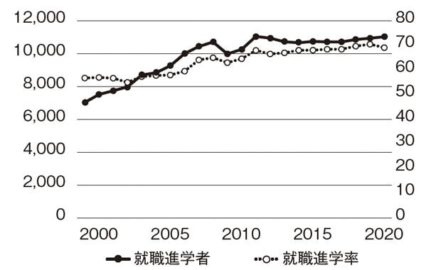 まずは進学者を含む就職進学者・率である(図3)。就職進学者数は2010年過ぎまで増加後は安定的に推移し、ここ数年は再び増加傾向にある。2000年を起点とすれば、2021年の就職進学者は1.6倍で、以前と比べて博士課程修了者は何らかの職に就くようになっている。このことは、就職進学率の上昇からも確認でき、2000年代半ばまで五割後半の低い水準で推移したが、2008年以降は6割台に上昇しその後も緩やかに上昇している。確かに、出口状況は長期的には改善傾向にあるものの、就職進学率の水準自体は決して高いとはいえない。