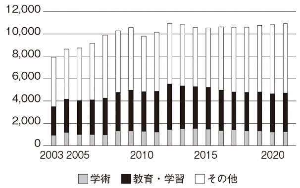 まず「教育・学習支援業」への就職者は、2003年の2,563人から2021年の4,091人まで拡大を続けるが、その後は減少傾向にある。全就職者に占める割合は3割台に留まるが、依然として最大の就職先である。続いて「学術研究、専門・技術サービス業」である。こちらも2003年の929人から2014年の1,531人まで拡大するが、その後は減少に転じている。この間、2つのカテゴリーが全体に占める割合は4割台で推移し大きな変化はない。なお、2つのカテゴリー以外で就職者が多いのは「医療・福祉」の中の医療業・保健衛生である。全体に占める割合に変化はないが、一貫して20%台半ばから後半で推移している。