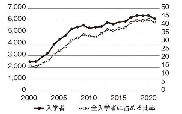 まずは志願状況から(図1)。修士課程への需要は、学士課程の求人動向に左右される──景気後退期に進学者が増加、という調整弁的な役割もあり、志願者数=需要といえない面もあるが、2010年代以降に増減の変化はありつつも12万人前後で推移している。専門職学位課程は制度発足後、志願者が4万人を超える時期もあったが、2010年代半ばにかけて急減し、その後は2万人前後で推移している。これは、法科大学院制度への期待と挫折によるものである。博士課程はどうか。2003年の22,550人をピークに減少傾向に転じている。2021年の志願者は17,729人で、ピーク時の79%の水準にまで落ち込んでいる。修士課程修了者の博士課程への進学率も、2000年には17%であったが低下を続け、2021年には10%を割り込んでいる。