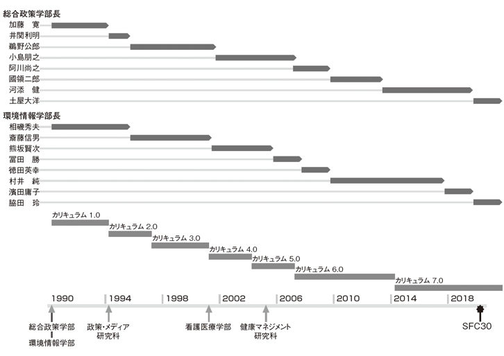 昨秋、政策・メディア研究科委員長に選ばれた直後、まずはSFC(湘南藤沢キャンパス)の簡単な年譜をつくった。タイムライン上に、いろいろな情報を書き加えてみる。いつ何が起きたのか、誰が何を決めたのか。少しずつ、「これまで」のSFCの輪郭が見えてくる。SFCは、総合政策学部、環境情報学部、看護医療学部の3学部、そして大学院政策・メディア研究科、健康マネジメント研究科の2研究科によって構成されている。いずれも、義塾の他学部・研究科に比べれば、その歴史は短い。それでも、2つの学部は創設から30年。平成とともに生まれ、時代の節目に向きあっている。ふり返るには、じゅうぶんに長い時間が経ったといえるだろう。
