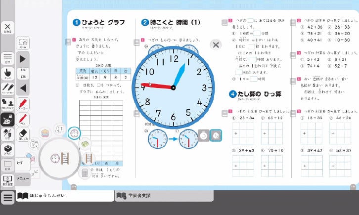 計19回のクラス・Web会議では、デジタル教科書も必要に応じて活用しました。オンライン学習の課題は、毎週配信され、毎日勉強する項目が設定されています。Web会議中に、教員のコンピュータからデジタル教科書の画面を皆で共有し、国語であれば「ほたるの一生」の単元において、文中の大事なところにマーカー機能でポイント解説を行ったり、算数であれば「時こくと時間」や「長さのくらべ方やあらわし方」の単元で、時計ツールや定規ツールを使って復習をしたりするなど、効果的に活用することができました。