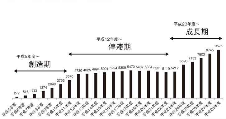 訪問看護事業所数は、現在1万カ所程度あり、人口1.2万人の地域に1カ所の計算になる。市場の成長は、次ページ図にあるとおり、平成5(1993)年度からの創造期、平成12年度からの停滞期、平成23年度からの成長期の3つに分けられる。人口減少時代において市場が縮小する業界が多い中で、訪問看護事業は伸びており、さらに2015年までには2倍の訪問看護師が働くことを日本看護協会としては目指している。