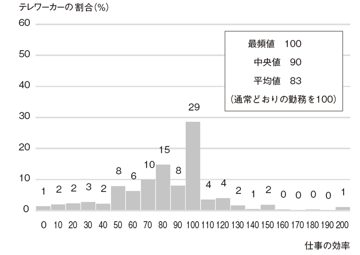 就業者実態調査ではテレワークでの仕事の効率性について聞いている(図5)。通常のように働いた場合を100として、現在のテレワーク勤務について0~200までの数字で答えてもらった。図のように、半数近くは100未満と答えており、平均は83で100よりも大きい数字を答えた人はかなり少ない。やはり、コロナ禍でのテレワーク勤務は前述のような様々な障害や問題のため効率が落ちているようである。
