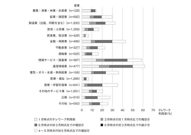 また、低い方をみると、運輸業(10%)、医療・福祉(5%)、飲食・宿泊業(4%)となった。緊急事態宣言時の4~5月では情報サービス、通信情報業が60%前後にまで上昇し、金融・保険業も40%を超えた。これらはもともとテレワークに対応しやすい産業であり、6月に入っても高い利用率を維持しており、ある程度テレワークが定着したものと思われる。一方で、飲食・宿泊や医療・福祉は1月時点で低かったがその後も低迷したままだった。