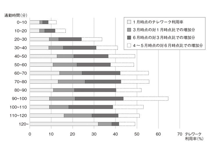 さらに通勤時間の面から東京圏での利用率を見る(図2)。片道30分~100分ほどの通勤者のテレワーク率の伸びが大きいことが分かる。郊外に居住し都心部に勤務している人が利用する傾向にある。通勤による苦痛がそもそも大きい上に、交通機関内での感染リスクも高いため、テレワークの利用が大きく進んでいるようである。また、郊外の場合、都心に比べて居住空間が広く、テレワークのスペースが確保しやすいことも要因だろう。今後、郊外からの電車通勤は少なくなり、テレワークにある程度置き換わる可能性がある。したがって郊外におけるサテライトオフィスなどテレワーク拠点の官民連携による整備が急務となるだろう。