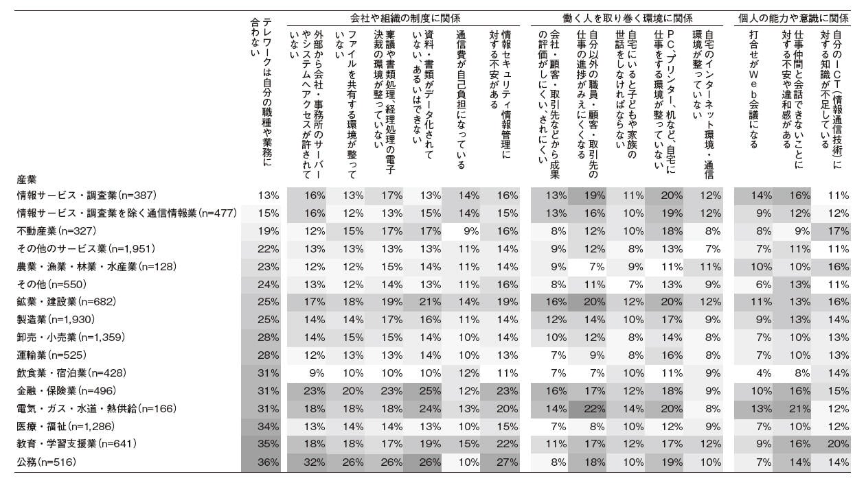 図4は業種別に集計したもので、自分の働く業種がテレワークに不向きと主観的に感じる人の割合、さらに3つの障害・問題に関して該当する人の割合を示しており、項目ごとに業種別での高低が分かる。