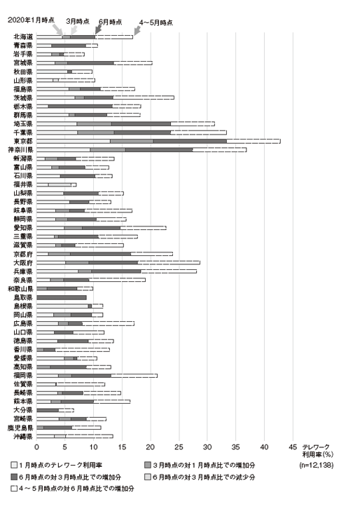 就業者実態調査の結果によると、全国の就業者のうちテレワークを利用した人の割合は、1月時点では全国平均わずか6%だったが、3月時点では10%に上昇し、緊急事態宣言が出された4~5月は25%に上昇した。宣言解除後の6月時点には17%に低下したものの、宣言前の3月時点に比べて7ポイントほど高くなっており、テレワークが定着してきているようである(注1)。