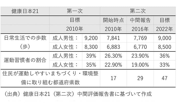 このように、日常生活における歩数や運動習慣者の割合の増加については改善が見受けられなかった。そこで中間報告書では、今後の目標達成に向けて、保健指導などによる個人に対するアプローチ以上に、生活環境に対するアプローチが重要であり、個人それぞれに意識させずに歩かせてしまうような環境づくりの推進が必要であると言及されている。