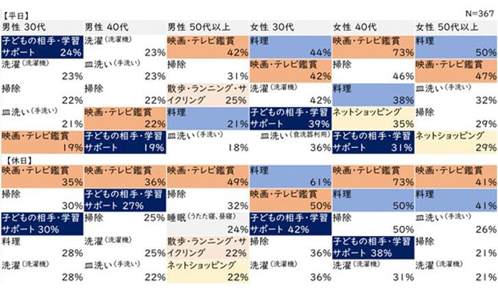 図2は、2021年1~3月に、昨年比で日中に増えた家事や行動を聴取したアンケート結果である。男女とも「料理」「掃除」等の家事と「映画・テレビ鑑賞」が増えているが、家事は女性が料理、男性が洗濯・掃除に傾向が分かれる。若年で「子どもの相手・学習サポート」が増える一方で、中高年で「ネットショッピング」(男女とも)や「散歩等」、「睡眠」(男性のみ)が増える様子も興味深い。