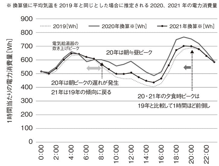これらに代表される暮らしの変化の中で、居住者の生活時間に影響を受ける電力消費量はどう変化したのか。図3に、4月を取り上げ時間帯別の電力消費量変化を示す。2020年は昼時と夕時の電力消費量の増加が顕著である。また起床時に見られる電力消費量のピークは、2019年から2020年にかけて2時間ほど遅くシフトし、かつ昼にかけて長引いているが、2021年にはピーク位置は元に戻っている。21年には小中学生が登校していることもあり、朝時間は定着していない。しかし、夕時のピークは、2019年から2020年、2021年ともに1時間ほど早くシフトしたまま定着しており、在宅勤務などの影響が出ていると推測される。