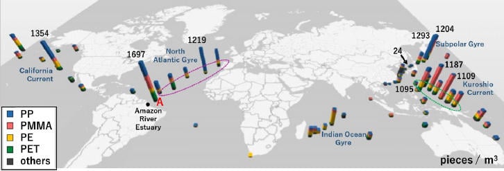 この世界初の調査により、我々の予想とは異なる結果が明らかになった。例えば、海洋中のマイクロプラスチック濃度分布は著しく不均一であり、21.6〜4660個/m3であった。特に、黒潮海流、北大西洋海流、カリフォルニア海流などの影響を受ける海域は高濃度であり、マイクロプラスチックの構成組成は還流別に大きく変わっていた。これらの成果は、還流間での移動が小さく、地域別に発生源やその特性が異なることを示唆している。つまり、海洋中マイクロプラスチック施策には、各還流に関わる複数の国の協調的施策が必要不可欠なのである。つまり、いくらEU圏が世界の舵を取っていたとしても、遠く離れた黒潮海流域はアジア、オセアニア諸国が主体となって施策を実施していく必要があり、それこそ、日本のリーダーシップが期待できるのである。
