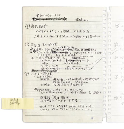 この「エンジョイ・ベースボール」という言葉を全国区にしたのは慶應高校野球部監督だった上田誠であろう。しかし、掲げ始めたのは大学野球部監督を計18年務めた前田祐吉である。冒頭の写真(下)は、前田が残したノートで、そこにはエンジョイ・ベースボールの意味として「工夫と創造の楽しみ」などとあり、「野球だけで人間ができる筈がない」「たかが野球」といった、挑発的なメモが並ぶ。