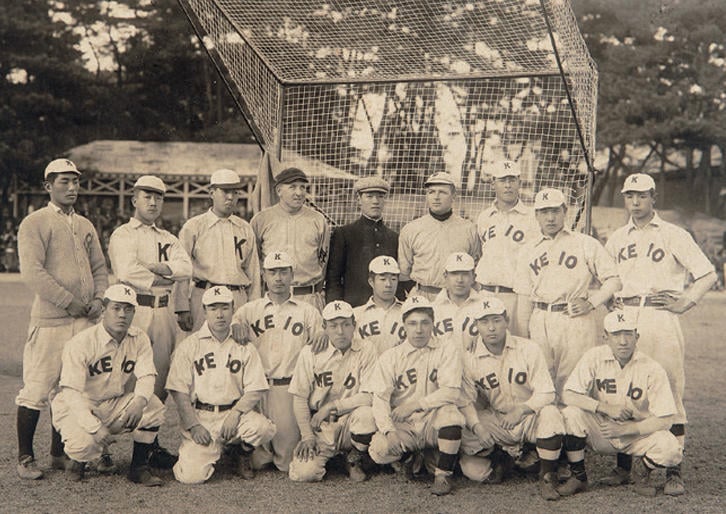 「エンジョイ・ベースボール」という言葉をはっきり記した文献は前田以前に見当たらない。しかし前田は、この言葉は野球部の大先輩から伝わってきたものと書いている。原点をたどる旅は一筋縄ではいかない。ここではパズルのピースをあと一つ。上の写真は、明治43年、慶應野球部が大リーグの猛将マグロウに依頼して2人の大リーガー、シェーファー(後列中央右)とトムソン(同左)を神戸に招いた際のもの。1カ月にわたる特訓合宿は、日本人が理論的、系統的に野球戦術を学んだ最初とされ、この写真は野球殿堂博物館にも飾られている。