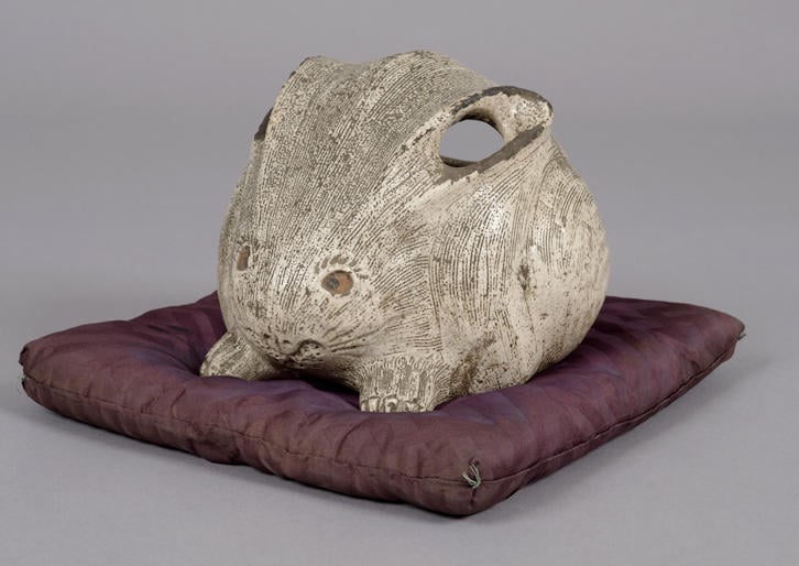 丸々としたフォルムに短くふんばった前足が愛らしいこの陶器製のうさぎは、浪漫と幻想の世界を描いた文学者、泉鏡花愛用の手あぶり(火鉢)です。