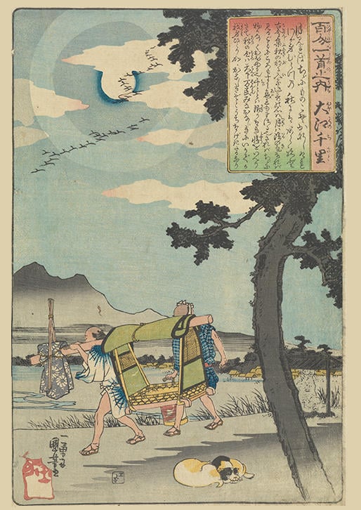 北斎の「百人一首うばがゑとき」は、「冨嶽三十六景」の成功後、天保6~7年頃に制作され、色数が多く豪華な摺りが際立ち、非常に手の込んだシリーズになっています。「うばがゑとき」とは、乳母が子供に百人一首の歌意を分かりやすく説明するという意味で、このように百人一首を解説するシリーズは当時の需要に応えた企画でした。「藤原道信朝臣」においては、「明けぬれば暮るるものとは知りながらなほうらめしき朝ぼらけかな」の歌意を、吉原通いの商家の男が、早朝、勤め先の店に急いで戻るという、江戸時代の風俗に置き換えて表しています。スピード感を全面に押し出し、駕籠の中の男の気持ちとはうらはらに、遊女との物理的な距離がぐんぐん離れていく様が際立ちます。他方、国芳の「百人一首之内 大江千里」は、「月見ればちぢにものこそ悲しけれわが身一つの秋にはあらねど」の歌意を、お客を運んだ後の空駕籠を背負った駕籠舁(か)きが、ふと足を止めて、夜空に輝く満月を見上げるという日常風景で表現します。西洋版画の表現から学んだ月光の表現、うずくまる猫(あるいは犬)といった景物が画面にリアリティを加えています。