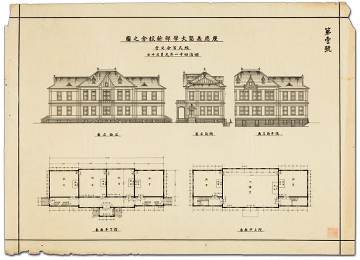 今回の展示準備で、1971年に中條精一郎の子息國男の中條設計事務所から、塾史資料室(福澤研究センターの前身)が慶應関係の建物の設計原図──青図などの複写物ではなく、設計者が直接引いた実物の図面──を筒入りの状態で52本譲り受けた記録が発見された。この52本を管財部工務担当の協力によって探索し、1本ずつ確認したところ、空襲で失われた信濃町の多くの建物の図面をはじめ、かなりの建物の何らかの図面が残存していることが確認された。そして最も古い図面がこの木造洋風の校舎「第六館」の図面であった。日付は事務所が開設された1908年。竣工は翌年で図書館よりも3年早く、現在の大学院棟付近にあった(写真下絵葉書)。1939年に日吉に移築され藤原工業大学予科校舎となり、6年後に空襲によって失われる。