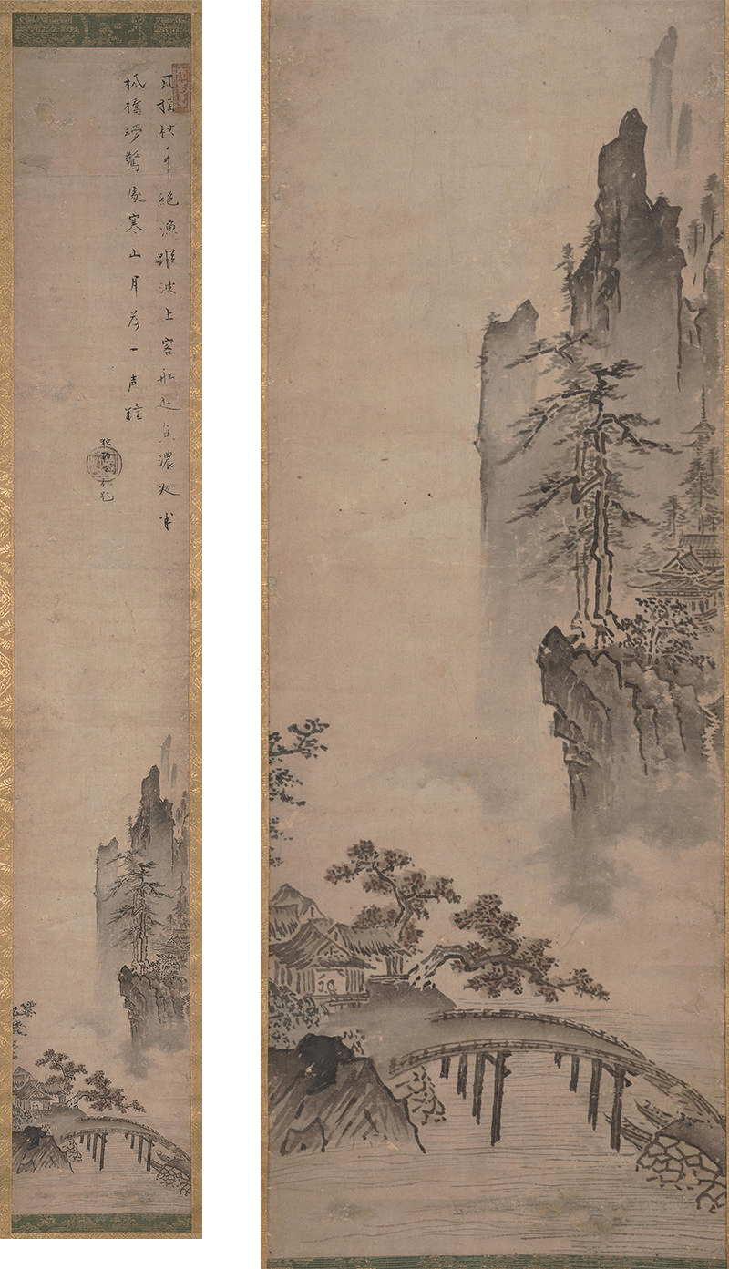 本図と画風画賛ともに類似する作品がバーク・コレクションにある。バーク・コレクションには「秀盛」印が捺されており、本図を描いたのも同一絵師と推定できる。秀盛は、雪心と同郷である美濃の武人画家か、あるいは雪心自身の自画賛の可能性もある。絵の中をよく見れば、画面右上の山の上に塔が見える。これは、寒山寺の塔で鐘の音はここから聞こえてくるのだろう。橋の袂には舟が泊り、対岸には赤褐色の紅葉した樹木がある。いくつか建物があり、屋内には人影もある。画中の時刻は夜半なのか、空は白んできているように見え、明け方に近いのかもしれない。詩と合わせて想像を働かせれば、旅人が遊興の後、静かになった船の中、鐘の音で目を覚まし、船外の景色を眺めた際のもの寂しさを追体験できるのではないだろうか。