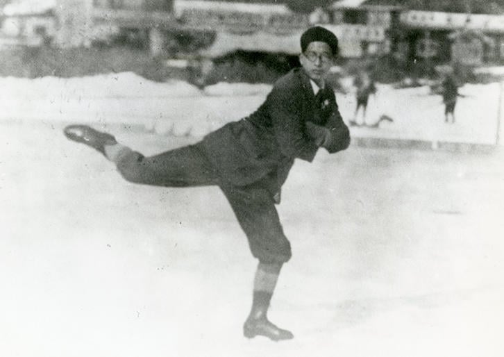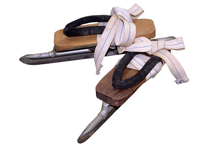 このスピード用の下駄スケートはそうした進化を遂げた大正期のものと思われる。旧蔵者は塾体育会スケート部草創期の選手・金子諭吉で、彼が大正末~昭和初期頃の諏訪中学校時代に使用したものだ。慶應義塾高等部に進学した金子はスケート部選手として全日本学生氷上競技選手権にてフィギュアで昭和3~5年個人3連覇、ホッケー(CF)で昭和4、5年連覇、スピードで昭和3、4年1万メートル3位と、3部門全てを牽引する八面六臂の活躍を見せた。下駄スケートは、卒業後も日本スケート連盟役員などを務め、戦後もスケート界を支えたこの重鎮の原点であった。