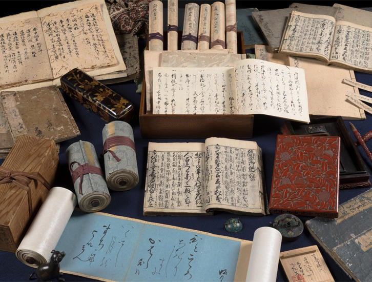 現在、慶應義塾大学附属研究所斯道文庫で膨大な旧蔵書の綿密な再調査と目録化が進む。2025年3月には、その調査のワーク・イン・プログレスを公開する展示「書物ハンターの冒険: 小松茂美旧蔵資料探査録I」が慶應義塾ミュージアム・コモンズで開催される。公家の礼節に関する規式「弘安礼節」(鎌倉末南北朝期、写真左上)、墨流しの表装が美しい松平定信旧蔵本(写真中央上)にはじまり、菅原道真の書法を伝授されたという手習い師匠が著した「菅家書則演義」(1810)まで、ヴァリエーション豊かなコレクションの一端を紹介する。