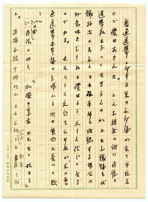 神戸に戻った梶原に活き活きと近況を書き送る交流は生涯続き、写真に掲げた小泉書簡では大正8年、日本への普通選挙導入に対して梶原が反対論を書き送ったのに対して、小泉は「僕はあきれた」「慶應義塾で正当な教育を受けた小泉信三はそんな臆病な了見は持てゐない」と熱く書き送る。