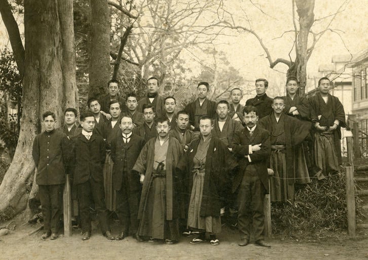精悍な若者たちと手前に教師たちが並ぶ1枚の写真。大学部政治科の明治43年の卒業生17名の集合写真である。場所は、現在では三田演説館が移築されている三田キャンパスの南西側の小高い丘、通称稲荷山で、背後には木造の校舎が建ち並んでいる。最前列は右から田中一貞、福田徳三、堀江帰一、林毅陸、そして田中萃一郎の錚々たる教師たちである。立襟の背広姿の林の真後ろに写る青年が、後の塾長小泉信三だ。この年22歳。後列右から2人目で腕組みをしているのが小泉の親友梶原可吉(かじわらかきち)である。この2人の大親友に阿部章蔵、のちの小説家の水上瀧太郎がいる。彼は小泉の1年上で、あらゆることに長けた青年であったが、成績のための勉強だけは怠り、2年後に理財科を卒業した。小泉の家は、稲荷山の石段を下りてすぐのところにあり、その家をはじめ、親友達は家を訪問しあい、あるいはお茶を啜りながら、あるいは酒を手に、闊達に語り合った。その輪には美術史家となる澤木四方吉や、作家の久保田万太郎なども加わった。今回寄贈のあった梶原可吉宛小泉・水上書簡はその談話が聞こえてくるような一群の書簡で、実に100通近くに上る。