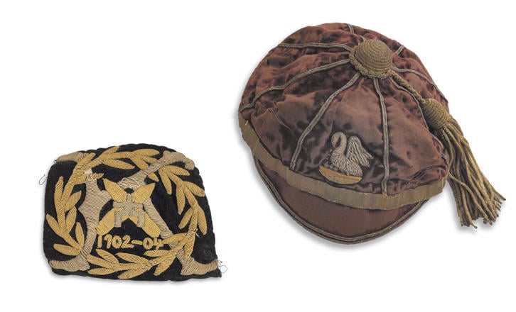 右下のペリカンの紋章入りのキャップはクラークの学んだケンブリッジ大学コーパス・クリスティ・カレッジのグラデュエートキャップで、卒業生にこのようなキャップを贈る文化はおそらくクラークと田中を通じて草創期の蹴球部に持ち込まれ、「イートンキャップ」と呼ばれた。左下はそのキャップの表面に縫い付けられたワッペン。部員がデザインを考案したと思われ、「K」と「O」(植物の装飾)に「大」の字入りペンマークがあしらわれている。「1902-04」という年代は現存で最も古いものである。