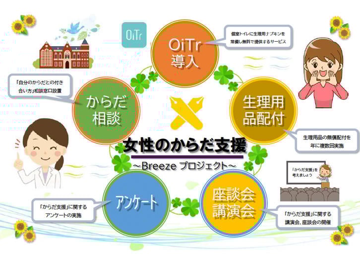 その状況を踏まえ、「女性のからだ支援~ Breeze プロジェクト」の取り組みがここに誕生した。つまり、単発での企画の実施ではなく、「女性のからだ支援」というものをトータルに見据えてその問題解決に取り組もうとする姿勢である。この取り組みは、次のような5つの活動を主な柱としている。