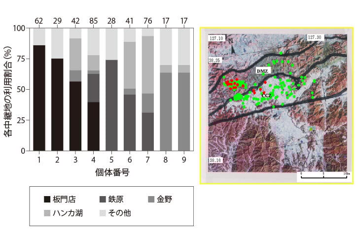 この追跡で、9羽のマナヅルが、渡りの過程でどこでどれほどの期間滞在するのかを調べました(図1)。それによると、4つの場所を主要な中継地として利用しています。北朝鮮と韓国を隔てる非武装地帯沿いにある板門店(パンムンチョム)、同じく非武装地帯沿いの鉄原(チョロン)、北朝鮮の東海岸沿いにある金野(クミヤ)、ロシアと中国の国境沿いにあるハンカ湖です。とくに非武装地帯沿いの鉄原と板門店では、多くの個体が長期にわたって滞在します。