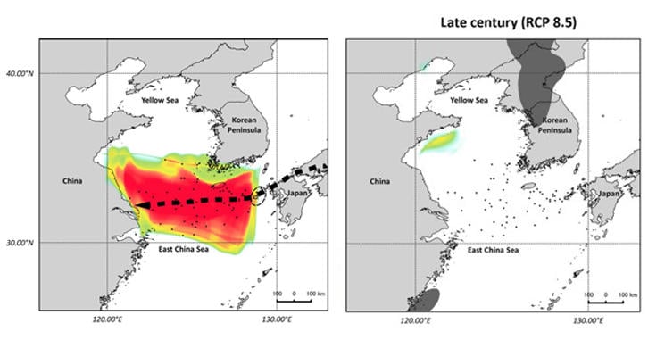 将来のハチクマの渡り経路をコンピュータによるシミュレーションで表した研究があります(図5)。IPCC(国連気候変動に関する政府間パネル)では、温暖化の進行についていくつか異なるシナリオが描かれています。中でも比較的影響が大きいとされるのがRCP8.5というシナリオです。このシナリオのもとでは、図中に濃い色で示された渡りの好適地が今世紀末には消滅してしまう状況が予測されています。その時、ハチクマはどうするか、ということまでは今のところわかりません。