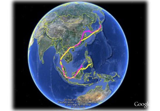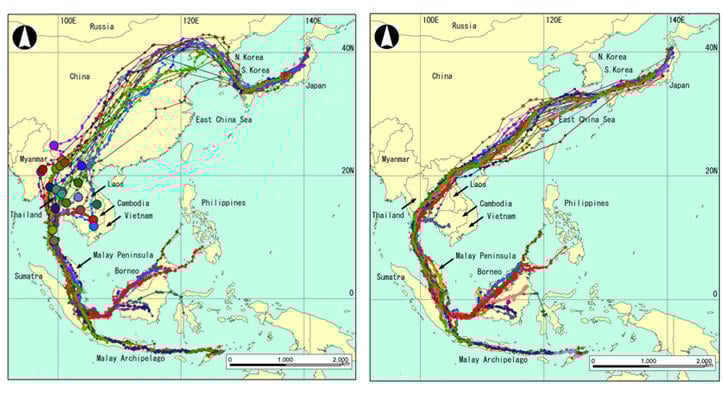 2月になると、日本に向けて春の渡りが始まります。途中までは秋の渡りの経路をほぼ正確に逆戻りしていきます。ボルネオ島のほうで越冬したグループも、ティモール島のほうで越冬したグループも、スマトラ島に戻ってきます。おもしろいことに、春は秋と違って、必ず全ての個体が東南アジアのどこか、あるいは中国南部のどこかで長期滞在します。