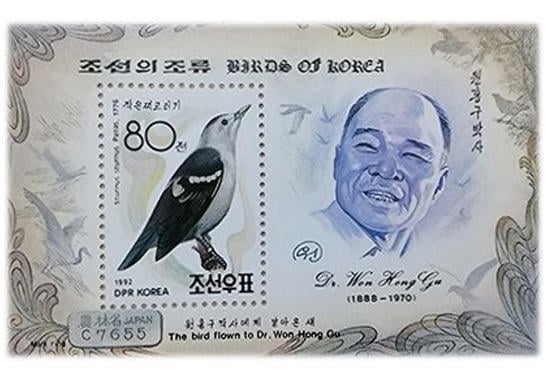 親子を結びつけたシベリアムクドリは、ささやかであったかもしれないけれど、「幸せを運ぶ青い鳥」だったと言えます。この出来事は、韓国でも、北朝鮮でも、中国、ロシア、日本、アメリカでも、当時大きな話題になりました。北朝鮮では記念切手が発行されました。切手にはシベリアムクドリや元洪九さん、足環のプレートが描かれています(図8)。映画にもなりました。