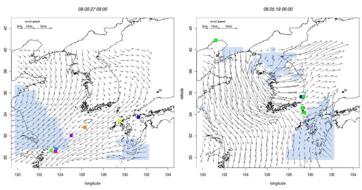 図4は最近、天気図でよく見るものですが、矢印の先は風向きを、矢印の長さは風の強さを示しています。図中の小さな○や□が、ハチクマ1個体の移動中の位置を示しています。グレーになっている部分は低気圧、つまり大きな雲のかたまりです。秋は東シナ海に南への追い風が吹いています。ハチクマはこの追い風を利用しながら700キロの海を越えていくのです。低気圧が発達すると、風向きが逆になったりするので留まらざるを得ず、福江島という日本の西の端の島に一旦留まりますが、追い風になると、またみんなで渡っていきます。