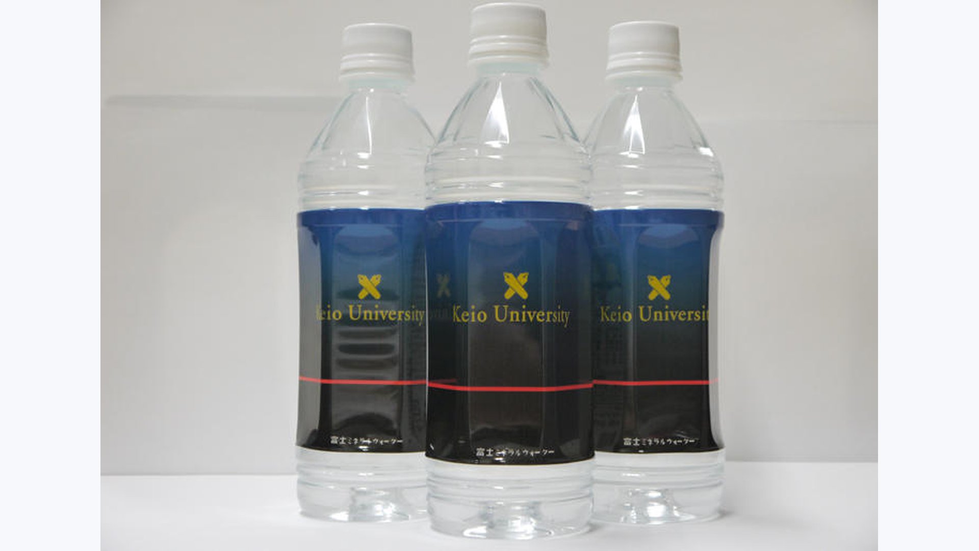 「慶應の水」は、2013年8月に誕生した。ボトルは三色旗がモチーフとなっており、紺地に赤色の細めのライン、中央にはペンマークが配され、キャップにもペンマークが添えられた上品かつシンプルなデザインが目を引く。