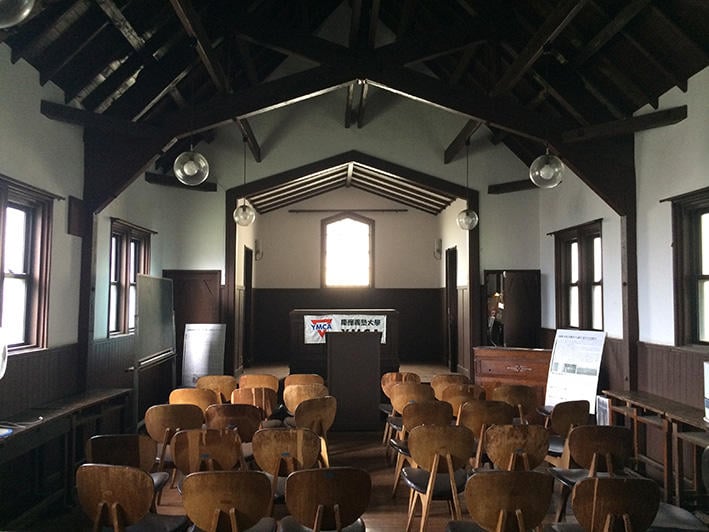 この建物は、木造、平屋建て、90㎡程度の小さな建物だ。外壁は白い吹付モルタル仕上げ、屋根は赤い鋼板で、特徴的なのは尖塔があり、その先に木製のシンプルな十字架が置かれている。建物の中は講堂と教壇があるだけだ。2012(平成24)年10月、横浜市の「横浜市登録歴史的建造物」として登録されている。戦後、日本が米軍に接収された時は、米軍がチャペルとして使用したと言われている。