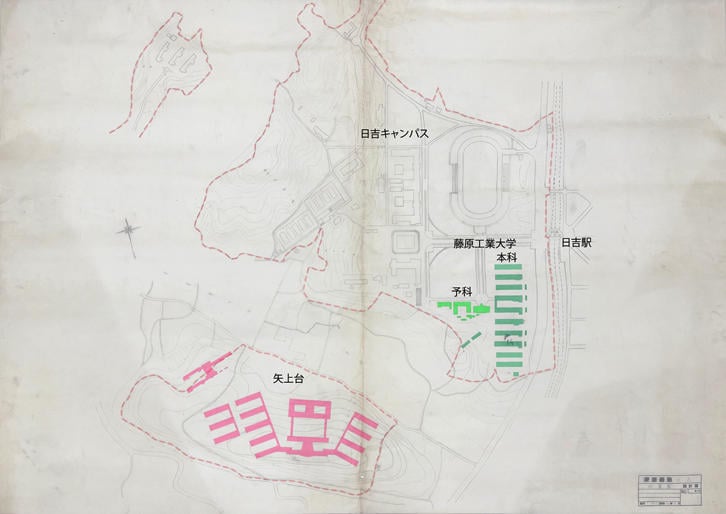 幻のペーパープランと言われ、残念ながら、その設計図は残っていないが、配置図が残されている。日吉内の藤原工業大学は、すべて木造校舎であるが、パース図に書かれている矢上の校舎は、丘の上に鉄筋コンクリート造で4〜6階建ての建物群が林立する、大プロジェクトの様相がうかがえる。しかし、当初の計画が変更となったことから、矢上の用地は手付かずのままとされた。