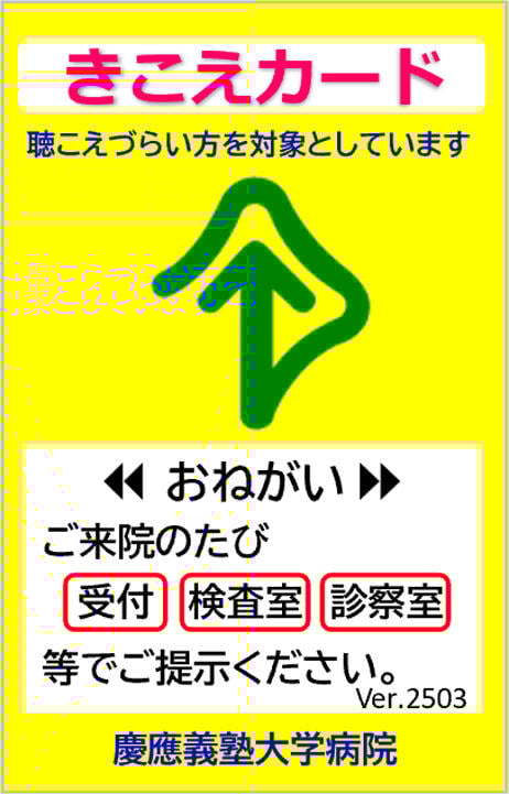 一番新しいサポートは2025年3月から始めたコミュニケーションサポート「きこえカード」です。耳が聞こえづらい患者さんが受付や診察の時に困っている、大きな声で会話するため高齢の患者さんを職員が怒鳴っているように見える、とのご意見から取り組みを始めました。患者さんが「きこえカード」を当院スタッフに見せると筆談や文字おこしアプリを使用する等配慮して対話する仕組みです。耳鼻咽喉科・頭頚部外科の医師や事務部門をはじめ関連する全部署の協力のもと作りました。