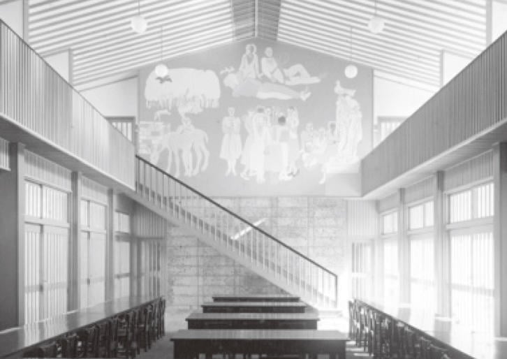 これは後に北門のところに移築されましたが、1990年代のはじめになくなりました。父はよく芸術家とコラボレーションをしましたが、この建築には猪熊弦一郎先生が壁画「デモクラシー」(⑥)を描きました。まだ戦後の暗い世の中にあって、猪熊先生の壁画は非常に明るい絵でした。その建築は今ありませんが、壁画だけは移されて、三田キャンパスの西校舎の生協食堂の中にあります。