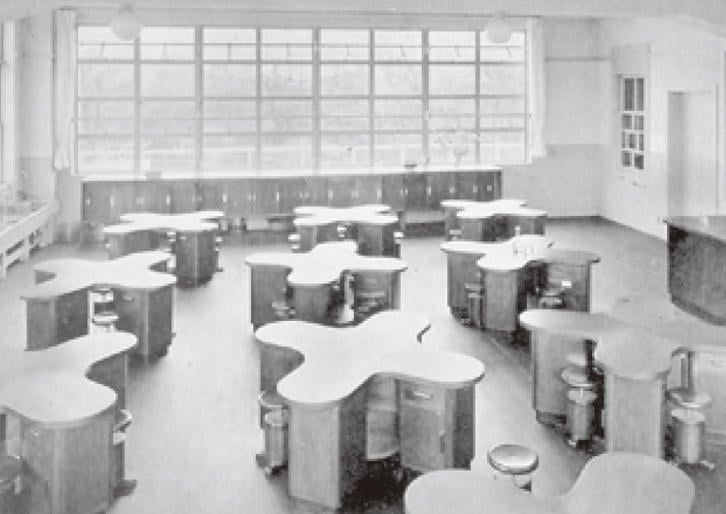 これは幼稚舎工作室(②)で、先生が上のほうにいて、下のほうで生徒が作業ができる。今でもあるのではないかと思います。理科室(③)もあり、当時としては珍しい机です。このように非常に印象に残るものがあったのが天現寺の幼稚舎です。一番嬉しかったのは2階から階段で直接運動場に出られることで、皆、元気に駆けずり回っていました。谷口先生のおかげで非常に幸せな建築環境で小学校時代を過ごさせていただいた。このことは後年建築家になってからも、とてもよかったと思っています。