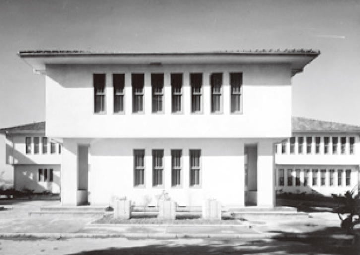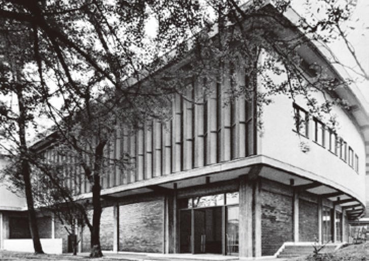 父が最初に設計した慶應の建物は先ほど槇先生がお話しされた通り幼稚舎の本館で、1937年の私が生まれた年に完成しました。他に代表的なものを挙げていくと、これは、戦後に建てられた三田キャンパスの学生ホール(1949年⑤)です。