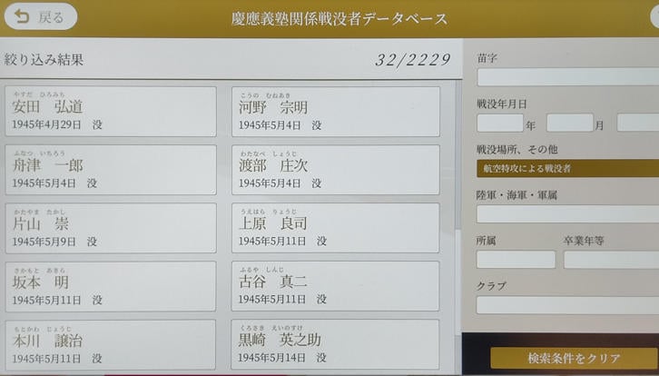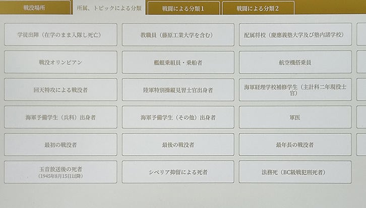 検索項目としては「苗字」、「戦没年月日」、「戦没場所、その他」、「陸軍・海軍・軍属」、「所属」、「卒業年等」、「クラブ」が用意され、利用者は自らの関心に沿って検索できる。とりわけ「戦没場所、その他」の項目は詳細にわたり、同項目のタブは「戦没場所」、「所属、トピックによる分類」、「戦闘による分類1」、「戦闘による分類2」の4つある。「所属、トピックによる分類」には「海軍予備学生(兵科)出身者」、「陸軍特別操縦見習士官出身者」、「戦没オリンピアン」、「軍医」、「従軍看護婦」、「シベリア抑留による死者」などのボタンがある。試みに「航空特攻による戦没者」のボタンを押せば、32人の氏名、戦没年月日が表示される仕組みとなっている。また戦闘による分類には「ノモンハン事件」、「ガダルカナルの戦い」、「インパール作戦」、「レイテ沖海戦」、「硫黄島の戦い」、「沖縄の戦い」など35のボタンを用意し、それをタッチすることで当該戦闘などで戦没した慶應義塾関係者の一覧が表示される。